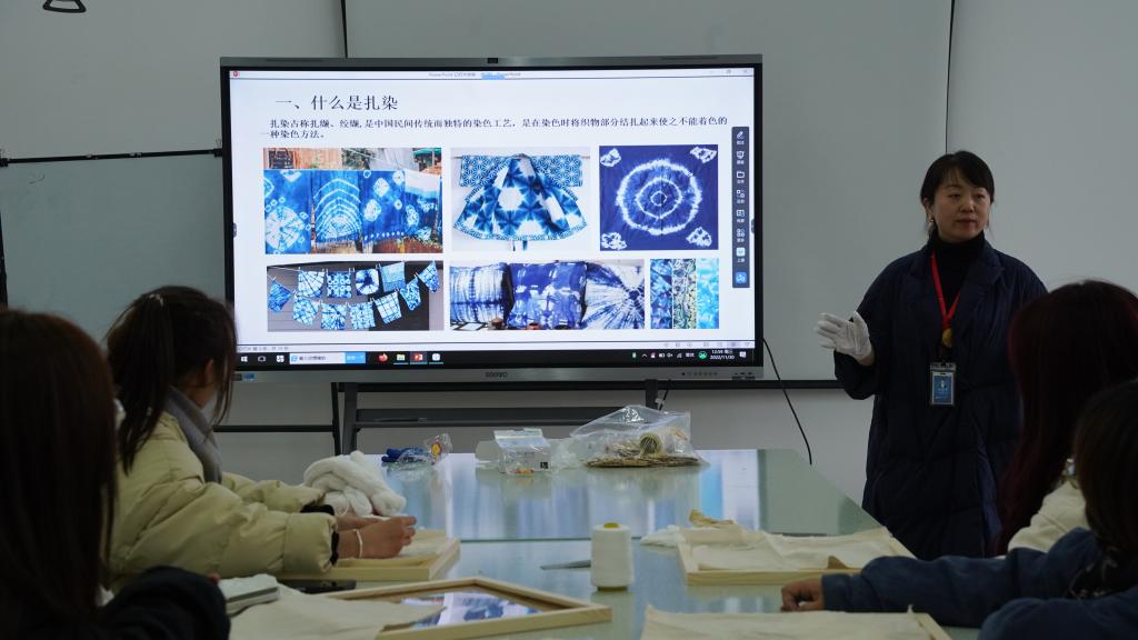 为了进一步加强大学生文化素质教育,丰富大学生校园生活,了解我国民间艺术,传承中华优秀传统文化,2022年11月30日,艺术设计学院教工第一党支部组织视传223班及艺术设计学院部分班级学生在软装与展示设计工作室举办了以“传承文化,匠心扎染”为主题的团建扎染体验活动,活动由教工第一支部书记王悦宁主讲。