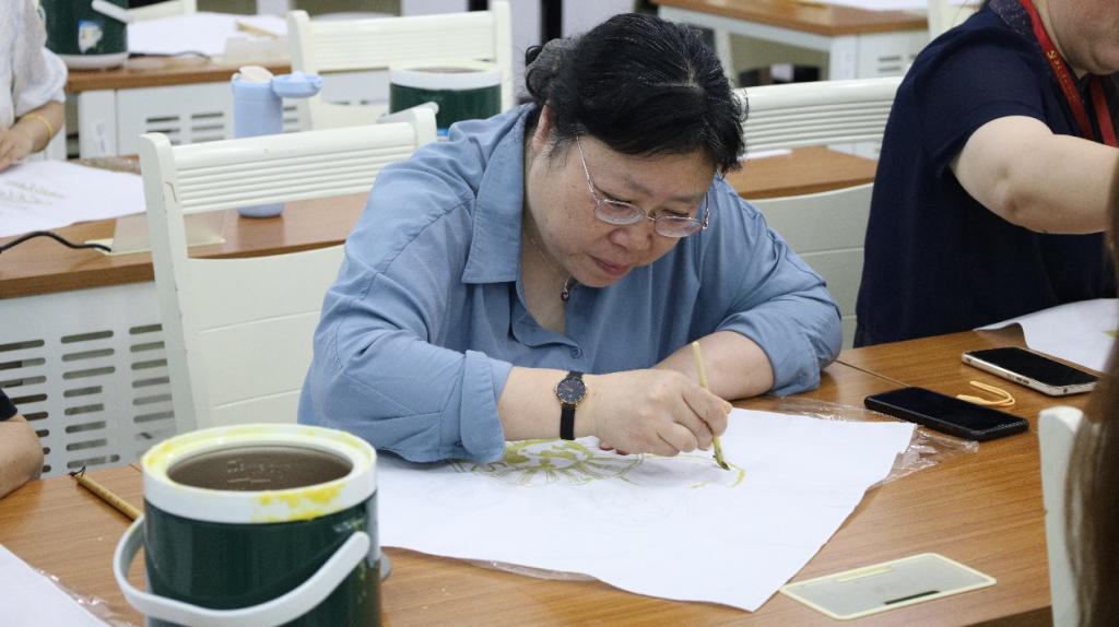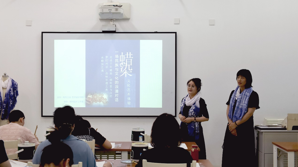 活动首先由“时尚工作室”负责人赵雪玉老师为来自各部门的女老师们普及蜡染文化,讲解蜡染艺术技法及注意事项。接着,她和工作室的胡欣蕊老师共同指导老师们体验蜡染制作。在场的老师们不仅全面体验了蜡染这项非遗艺术的魅力,还现场制作了自己的第一幅蜡染作品。