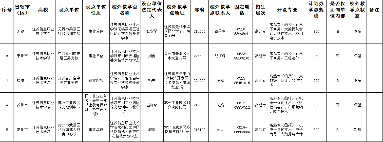 根据《省教育厅办公室关于开展高等学历继续教育自查和校外教学点备案工作的通知》(苏教办高函〔2023〕32号)文件精神,经站点申请,继续教育学院自查,校长办公会和党委会讨论通过,拟保留和拟新增校外教学点如下表所示,备案结果以江苏省教育厅公布的文件为准。